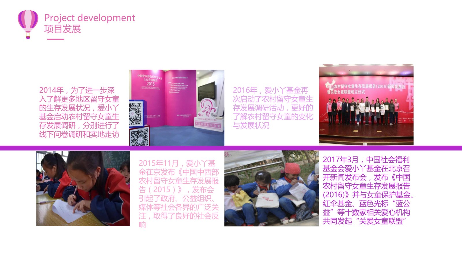 9月深度参与中国社会福利基金会“爱小丫”项目,除99日进行了捐款外,10月以“女生加油”为口号在英国组织各国学生及老师声援此次活动,随后也参与到了公益探访。之后将与爱小丫基金开展更加深度的交流与合作,为此项目提供更加有针对性的帮助与支持。